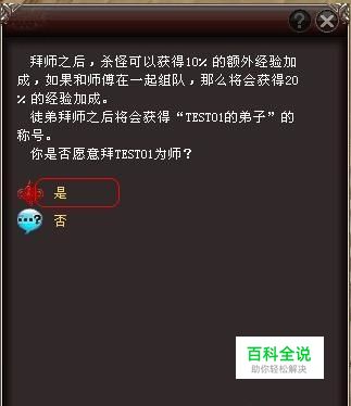 徒弟弹出拜师确认界面,点击【是】完成拜师仪式。双方形成师徒关系。