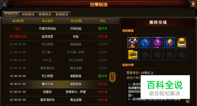 暗夜之神魔将攻城是每个玩家都期待的,毕竟有大量的奖励在等待大家,这些诱人的奖励是大家都想要的,那么魔将攻城怎么参与呢?魔将攻城可以获得什么奖励?接下来就给大家简单的说说魔将攻城的参与方式以及魔将攻城可以获得的奖励吧。 魔将攻城参与方式: 点开游戏上方日常玩法图标,选中魔将攻城活动,点击参与活动即可。 需要等级:60级以上 活动介绍:周一、二、五20:00-21:00 1.活动开启后,玩家需要保卫暗夜女神并且抵御魔物的入侵直到活动结束,击败入侵的怪物可以获得卓越装备、宝石、金币等奖励 2.活动期间参与活动的玩家每10秒可获得1次经验与金币奖励。 魔将攻城获得奖励: 1.双属性卓越装备 2.祝福宝石 3.灵魂宝石 4.玛雅之石 5.经验120万 6.金币20万 关于暗夜之神魔将攻城的玩法就是上面介绍的这些啦,大家可以在活动开始去参与一下哦~丰富的奖励在等待大家~