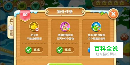 方法/步骤 1. 一如既往,先来看看额外任务: 1、关卡中不建造便便塔。 2、使用船锚炮塔消灭100个怪物。 3、在300秒内找到12个隐藏的炮塔。