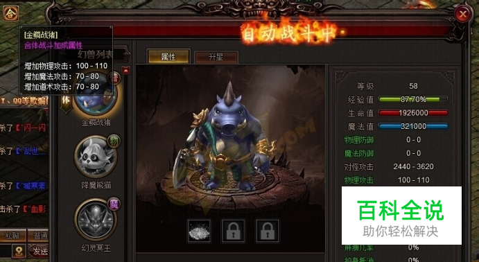 前面已经为大家介绍过了雷霆之怒幻兽合体的方法。大家都知道幻兽合体后,人物是可以获得合体属性的。那雷霆之怒幻兽合体属性怎么算呢雷霆之怒幻兽合体属性又有哪些呢下面就让小编为大家介绍一下吧。 雷霆之怒幻兽合体后,系统有“合体成功,角色属性增强”提示,同时人物头像下方会出现一个合字的图标,这便是玩家与幻兽合体,所获得属性加成。大家只要鼠标移至该图标上,便会有合体战斗加成属性说明。如升星等级为0星的55级金鳞战猪与人物合体后,可以获得增加物理攻击:100-110;增加魔法攻击:70-80;增加道术攻击:70-80这三项属性。雷霆之怒幻兽合体还可以获得物理防御、魔法防御、暴击力、麻痹几率、护身抵消、沉默几率这些属性,这些属性主要通过提升幻兽的升星等级来获得。 大家也可以直接打开幻兽界面,在幻兽界面右侧栏会展示幻兽的相关属性。其中属性值分为两种颜色,一种是灰色,另一种为绿色。灰色状态的属性值,主要是幻兽在解体状态下,所自带的属性值;而绿色状态的属性值则是人物与幻兽合体所得的合体属性值。大家要想提升幻兽的合体属性值,记得平时多去收集多一些幻兽灵力丹,来提升幻兽的升星等级。雷霆之怒幻兽灵力丹各种怪物、boss都会有几率掉落,而且一些日常活动也会有掉落。