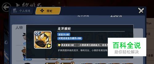 黑龙套装另一件,龙牙腕轮,攻击力增加80点,对恶龙的攻击力提升188点。当组成套装之后,小黑获得三段跳能力,攻击力再加50点。