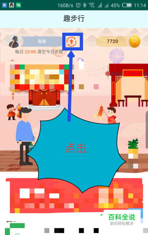 趣步行的步数是和微信同步的,在打开的趣步行的首页界面,点击头像右边步数的红色的向上箭头。如图所示