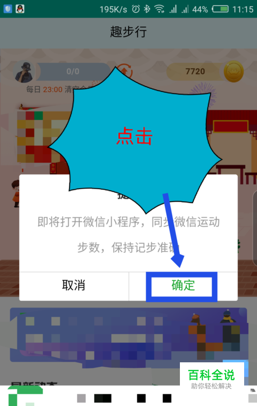 点击箭头后,打开一个提示窗口,需要打开微信小程序,同步微信步数,点击右边的确定。如图所示