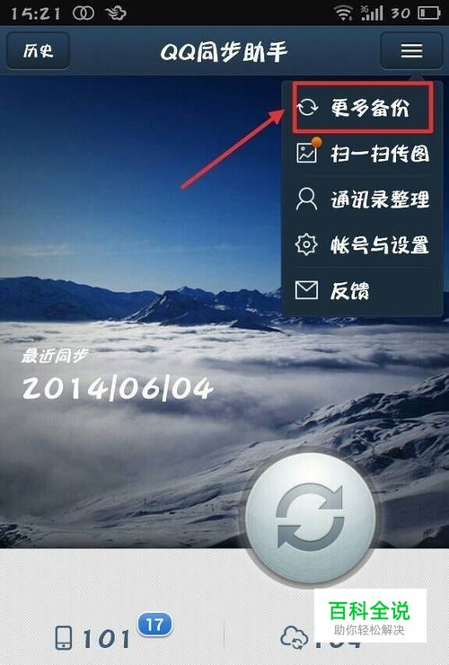 打开QQ同步助手,点击右上角的三横的小图标,出现很多菜单,点击”更多备份“。