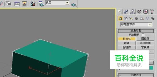 打开3d max软件,鼠标左键单击右边面板的【几何体】按钮,选择【长方方体】,在透视窗口中拖放出一个长方体出来,并更换颜色为绿色,如下图所示。