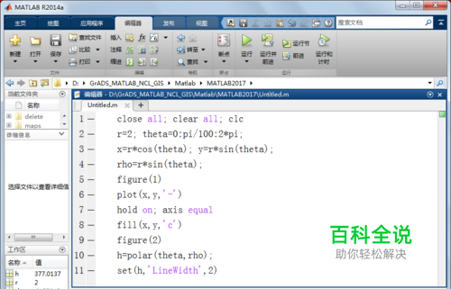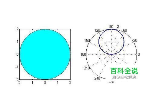第一,启动MATLAB,新建脚本(Ctrl+N),输入以下代码: close all; clear all; clc r=2; theta=0:pi/100:2*pi; x=r*cos(theta); y=r*sin(theta); rho=r*sin(theta); figure(1) plot(x,y,'-') hold on; axis equal fill(x,y,'c') figure(2) h=polar(theta,rho); set(h,'LineWidth',2)