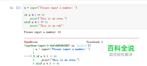 n = int(input("Please input a number: ")) if n % 2 == 0: print("This is an even.") elif n % 2 != 0: print("This is an odd") 我们要注意要定义输入的变量是整型,因为字符串是不能进行运算的。