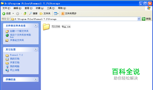FOXMAIL7.2邮件默认的安装目录为:D:\Program Files\Foxmail 7.2\,如果用户不小心将邮件安装在C盘,那以后重装系统,需先对邮件数据进行迁移,此时我们可以找到原来的邮件数据,一般在安装目录:\Program Files\Foxmail 7.2\Storage 的Storage下面保留着原来的邮件数据。例中的邮件数据保存在D:\Program Files\Foxmail 7.2\Storage下面。