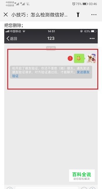 第一步我们向微信好友发一个表情,如果出现开启了朋友验证,你还不是他的朋友提示,代表对方已经把你删除了,如下图所示: