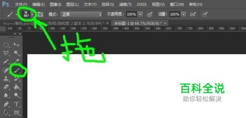 打开PS(我的版本是PS CS6),点击画笔工具后看我标识的地方,把选的所有笔刷往这里一拖