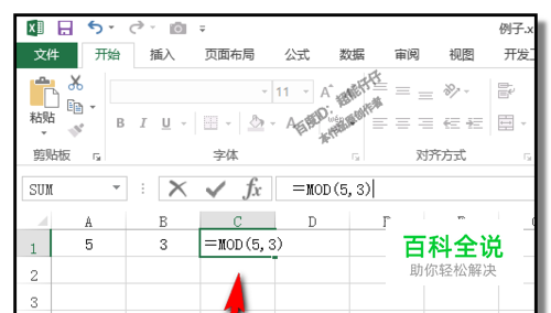 比如,要求出5除以3的余数,我们可以用MOD函数来得到。 输入:=MOD(5,3) 按下回车键,即可得出余数“2”