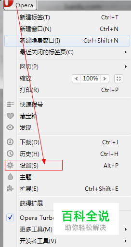 打开opera浏览器,点击左上角菜单图标,然后单击“设置”。