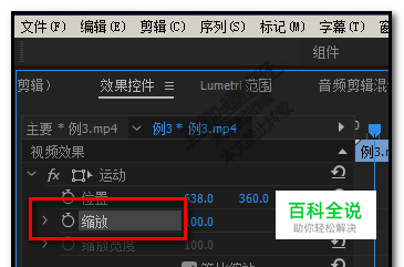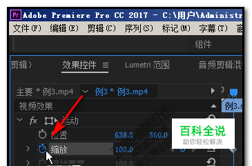 在效果控件面板这里, 我们找到要打关键帧的选项,比如,缩放