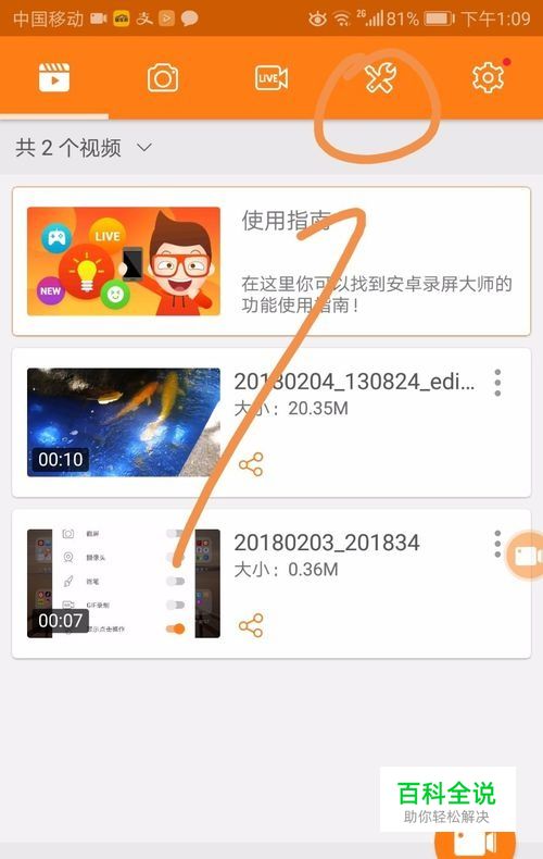 进入安卓录屏大师界面后点按界面上方的扳手螺丝刀标志。