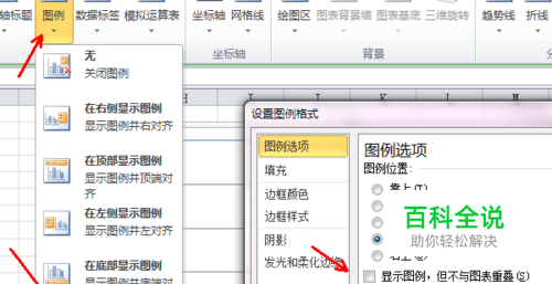 还有一种修改图例位置的方法就是在图标工具里面切换到布局,点击图例,比如选择在右侧覆盖图例,可以看到图例出现在折线图上,此时打开设置图例样式的窗口可以看到最后一项“显示图例,但不与图表重叠”取消了勾选,明白怎么用了么