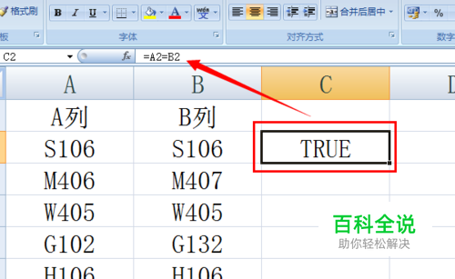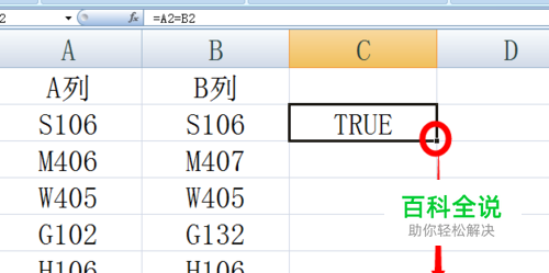 如图所示的两列表格,如图想要找到两列之间的差别,可按以下步骤来操作: 在C列输入公式“=A2=B2”,该公式表示:当两列对应位置的内容一致时,显示“TRUE”,否则显示“FALSE”。