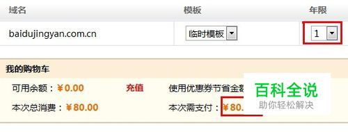 付款并管理域名 到了付款这一步,你就要冲钱到这个网址注册商先了,一般支持支付宝的,记住,域名是有年份限制的,比如如图这个,一年80块,到了明年这个时候,你如果不续费,这个域名会被收回。买了之后,可以到我的域名里进行交易等管理。
