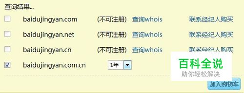选择后缀 我们可以看到,比较热门的后缀网址都被注册光了,我们现在要么选择向别人花钱买,或者选一个别人没注册的,比如说如图的最后一个,我们选中,加入购物车。