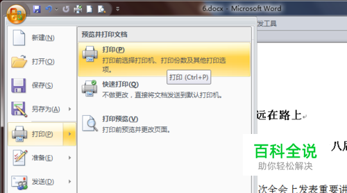 在 Word 中打开一篇文档,点击“文件”——“打印”菜单项,准备开始打印工作。