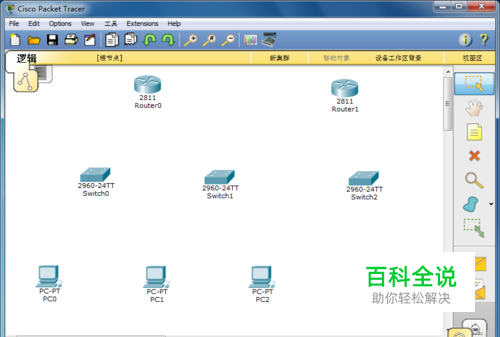 首先打开思科模拟器软件,找出两台2811类的路由器,3台交换机和4台电脑,让它们有序的排列起来,如下图所示: