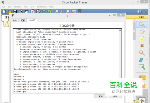 配置路由b,配置命令如下: b>enable b#conf t Enter configuration commands, one per line. End with CNTL/Z. b(config)#int s0/0/0 b(config-if)#ip add 192.168.100.2 255.255.255.0 b(config-if)#no shut b(config-if)#int f0/1 b(config-if)#description line to lan20 b(config-if)#ip add 192.168.40.1 255.255.255.0 b(config-if)#no shut 如下图所示: