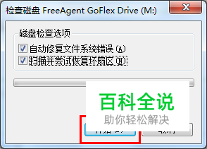 并在检查磁盘窗口中,同时勾选“自动修复文件系统错误”和“扫描并尝试恢复坏磁盘”,点击“开始”按钮进行修复。