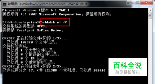 然后输入命令“chkdsk m: /f”(其中M代表磁盘对应盘符)来尝试修复磁盘错误。