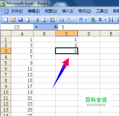首先在旁边输入起始值1,然后手工输入顺序数据3和5