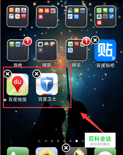 首先打开苹果手机,然后在手机桌面上长按其中一个软件图标,让图标抖动起来,图标左上角出现打叉符号。如下图所示。
