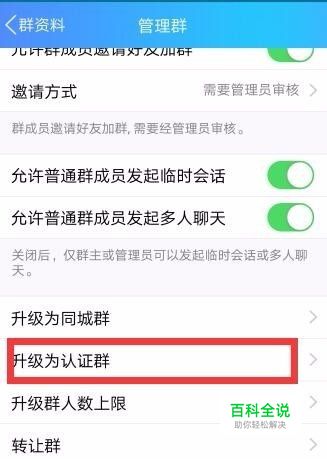 首先,点击QQ群右上角,进入群资料页面,找到管理群选项,拉到升级为认证群的功能,点击进入认证说明页面提示:请在PC端QQ进行认证。