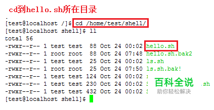 【步骤一】cd到要重命名文件所在目录 cd到hello.sh的目录,cd /home/test/shell/,如下图