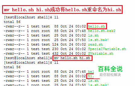 【步骤二】用mv重命名hello.sh文件 mv hello.sh hi.sh,如下图