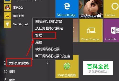单击左下角的开始菜单,右击其中的【文件资源管理器】——【管理】。