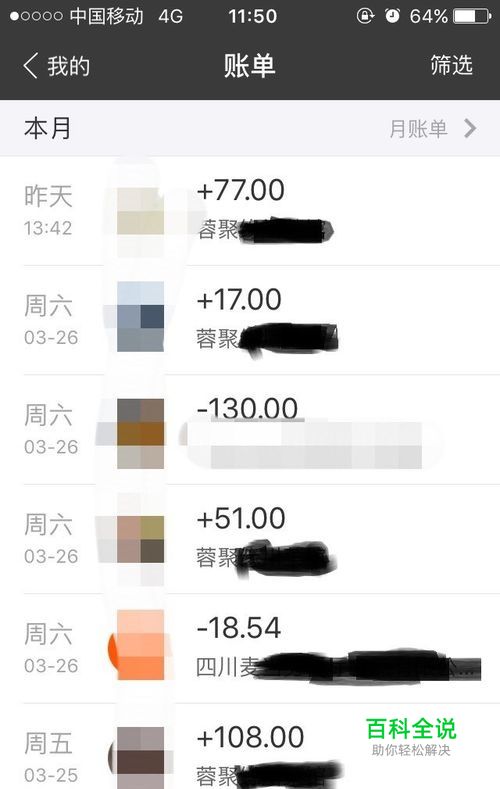 然后,你看到的就是这几天及这几个月的收入与支出情况。为了保护个人隐私,所以名称部分打了马赛克。
