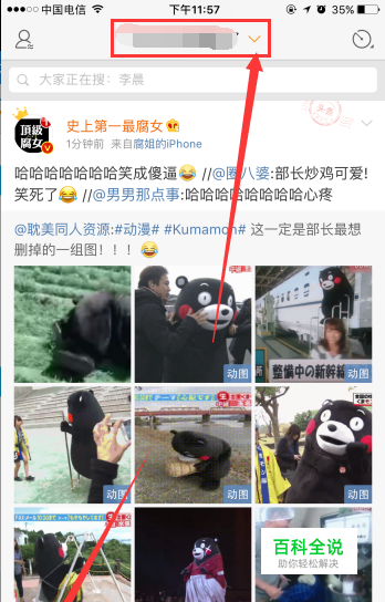 打开手机微博客户端,找到首页,在你的昵称旁边找到一个下拉按钮