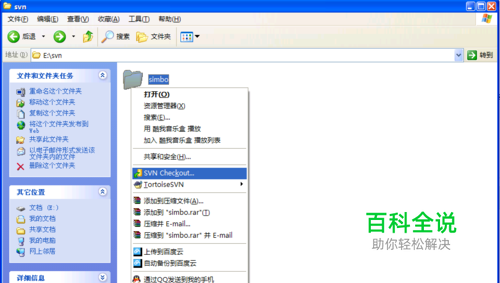 安装完后随便打开一个文件夹,如图,笔者在 E:\svn\ 文件下创建了一个simbo文件夹,选中并右键,出现了TortoiseSVN应用的选项,我们点击“SVN Checkout”,拉取远程的svn库文件,