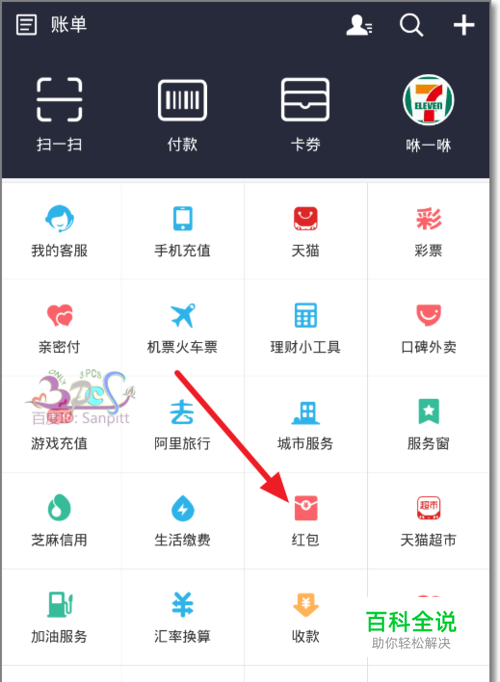 将你的支付宝更新到最新版本,点击主界面中的红包。