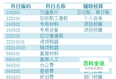 以同样的方式继续增加其他科目。注意“22210101 进项税额”的科目性质(余额方向)需要调整为“借方”。 “工程物资”的明细科目的“辅助核算”项目需要勾选“项目核算”,图中以增加“160501 专用材料”科目为例。
