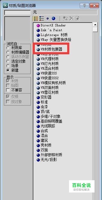 选择弹出对话框里面的vr材质包裹器,点击确定。这个材质是要安装和打开vr渲染插件后才会显示哦,如果不知道怎么开的朋友请移步下面的经验引用小蓝字,点击字就可以转到。找到这个材质的请继续下一步。