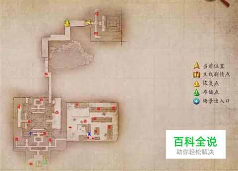 锁住的宝箱:(空劫疾遁符2,天府金钟符2,烛龙铸钱)(金镶玉,帝女之霜)(袖炮5,六筛格3,神火飞鸦2) 怪物图签:富豪鬼6,红衣厉鬼5,莲花鬼灯8,食肉鬼7,方兰生1,叶沉香1 进入自闲山庄后可以看到兰生的前生,要进入有锁的门先要去地图右边找到大富豪取得钥匙,大富豪就藏在地下室内(蓝色叉表示) 开门进入后这里是没有宝箱的,只有3个采集点,蓝色路线通向BOSS