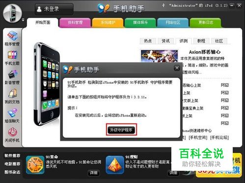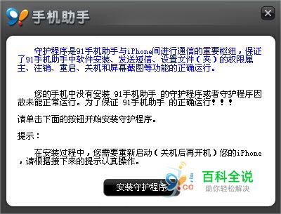 连接识别手机:用数据线将手机和计算机相连接,打开91手机助手,此时计算机屏幕会提示安装或升级守护程序。安装或升级完成之后手机助手就会识别到手机。