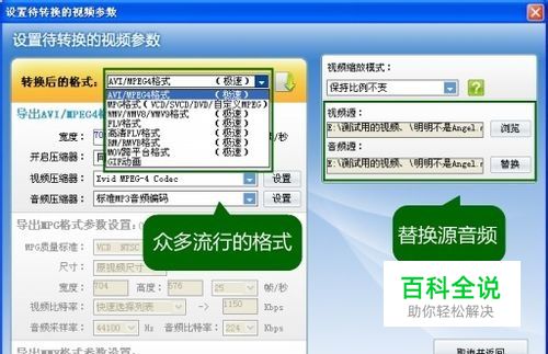 选择导出的格式 选择导出rmvb格式,在下图中,就能自定义设置视频的参数。如果你对这一块不熟的话,可以选择默认软件的参数,导出的视频效果清晰。另外,按照下图的指引,点击“替换”按钮,将原音频替换成自己喜欢的音乐。