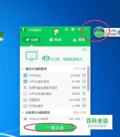 一键加速 当长时间用电脑的时候,电脑的速度就会有所下降,如果电脑上有安装360安全卫士的话,则可以点击360加速器,然后点击【一键加速】,如下图所示: