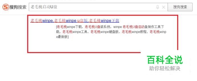 首先,打开使用搜索引擎搜索“老毛桃启动U盘”关键字,在搜索结果页面中,点击进入启动U盘工具下载页面。