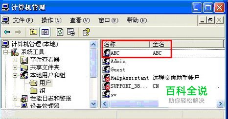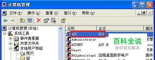 WinXP下的用户帐户分两个标识,分别是“名称”和 “全名”,第一次创建时两者是完全一样的,假设创建的是ABC,在计算机管理-本地用户和组 --> 用户里显示如下图所示。