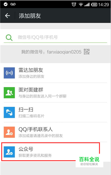 打开微信,选择添加公众号选项。