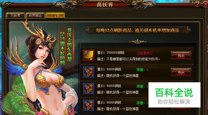 8090仙凡传全新升级,重磅更新!为万妖界增加了大量的新玩法!而其中,最实惠,最吸引人的地方,非万宝殿莫属啦! 万宝殿,顾名思义,当然是要有一堆宝贝在里面啦!在游戏里,大量原本只能在商城中用大量元宝才能买到的道具,现在铜钱就可以买啦!而且不贵哦! 从上图可以看到,一本商城卖200元宝的2阶技能书,这里只要250W铜钱就可以啦!真是太实惠! 万宝殿每天晚上12点更新,基本数量为4件宝贝,通关副本会有几率增加商品数量,打的越多,宝贝就也越多哦! 好了,关于8090仙凡传万宝殿,就介绍到这里。希望能帮到大家哦!