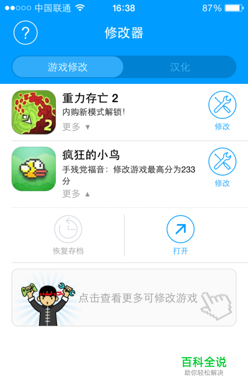 找到该游戏后,点击右侧的“修改”,然后会弹出“修改中”窗口,稍等片刻,修改完成。