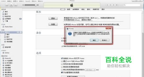 使用同步资料库这种方法需要我们将“手动管理音乐和视频”的勾选取消,这时iTunes会提示我们:“如果取消手动管理,那么iPhone中已有的音乐和视频都会被替换为资料库中内容”。确定的话就会自动开始同步,并且每一次连接都会同步一次,所以要小心。如果手机中有重要的数据,建议不要确认。