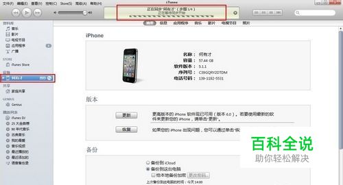 将数据导入手机我们就要先将设备与电脑连接,打开iTunes,左侧列表中会出现自己的设备名称,需要注意的是,在连接之后iTunes会自动备份,无视就可以了。